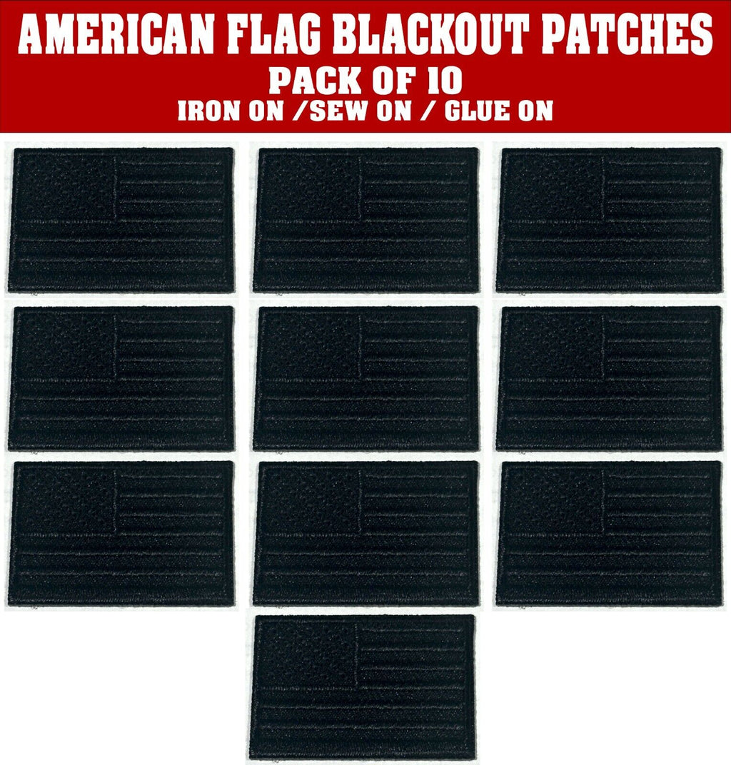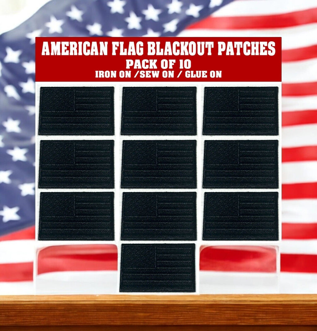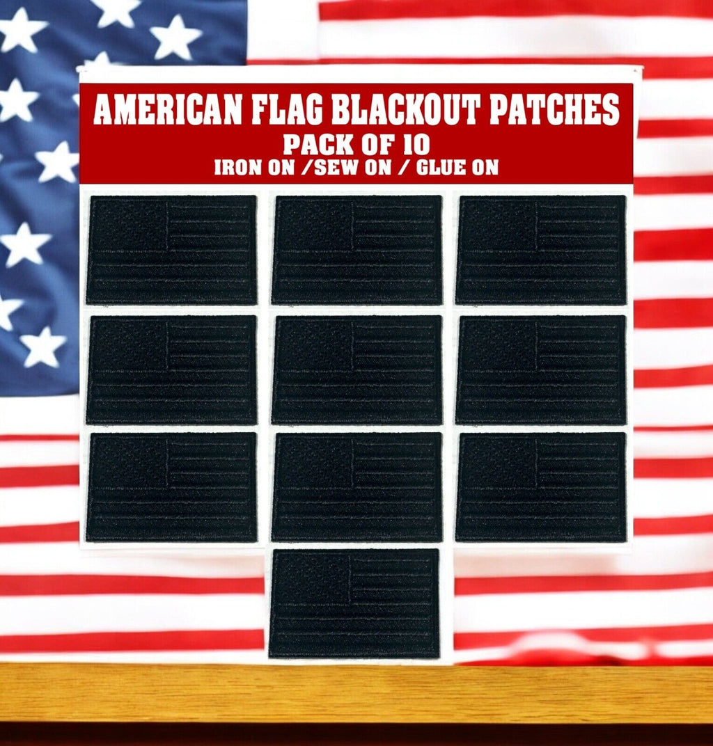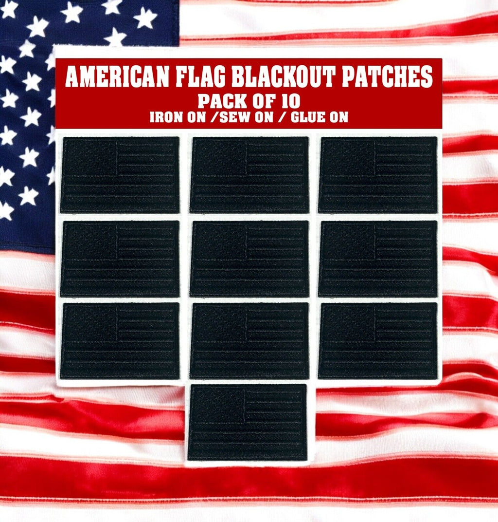 This is a 10-pack of BLACKOUT TWILL American flag patches measuring 1" x 1.5", suitable for iron-on application. The patches are embroidered and feature the USA flag design. They are made in the United States and can be used on bags/purses, apparel, and crafts, suitable for both adults and children. Apply them with a Hat press, a heat press, and iron or other application product. They can also be stitched on or glued on as well. Each patch has heat seal already applied to the back.
