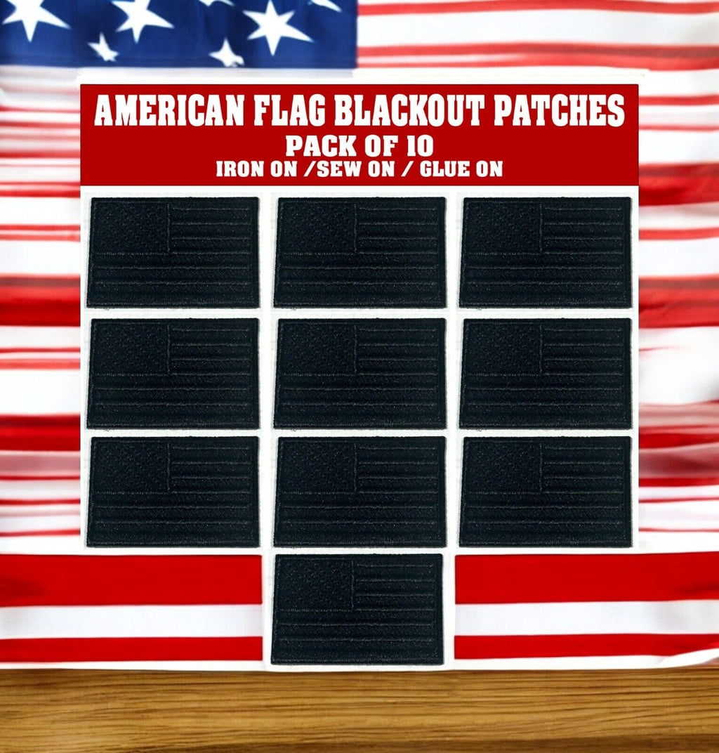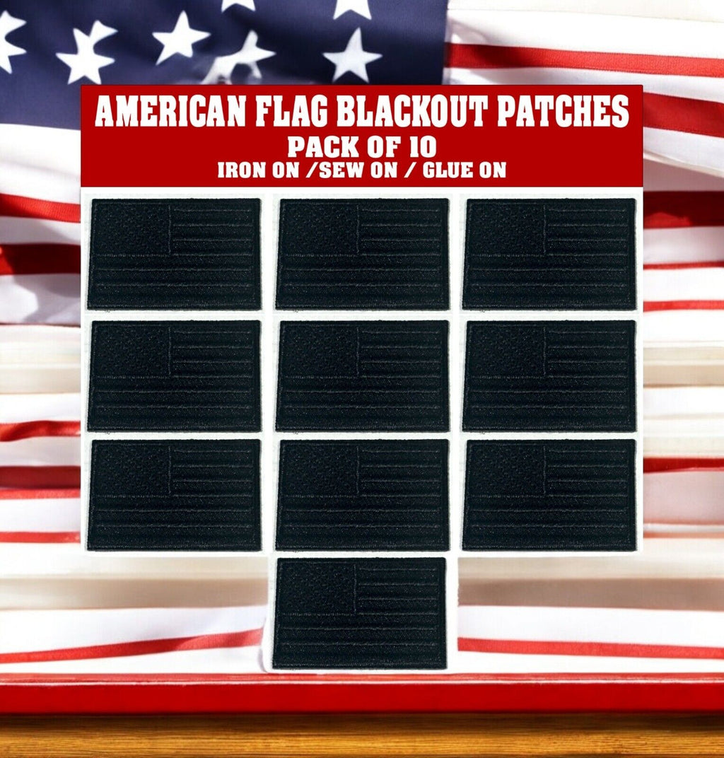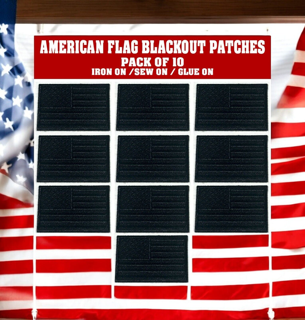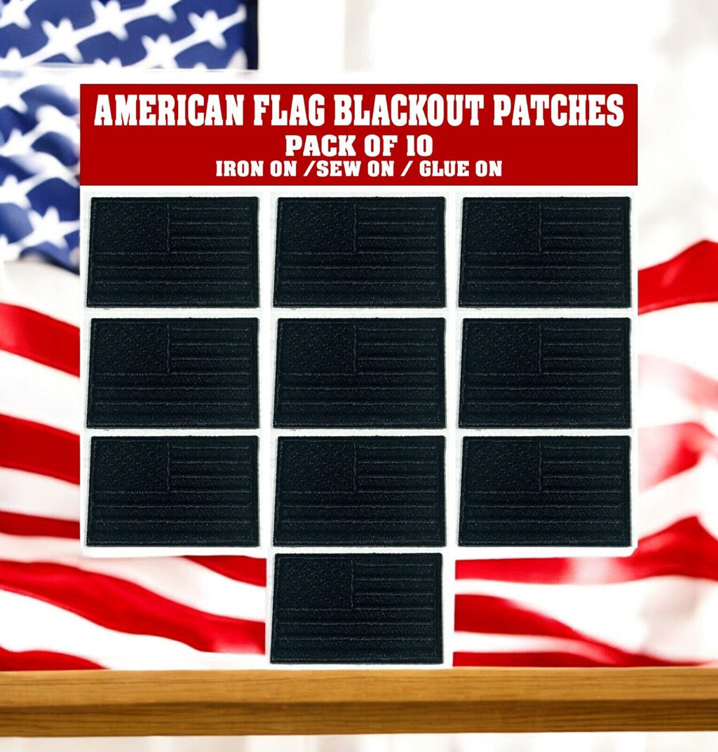 This is a 10-pack of BLACKOUT TWILL American flag patches measuring 1" x 1.5", suitable for iron-on application. The patches are embroidered and feature the USA flag design. They are made in the United States and can be used on bags/purses, apparel, and crafts, suitable for both adults and children. Apply them with a Hat press, a heat press, and iron or other application product. They can also be stitched on or glued on as well. Each patch has heat seal already applied to the back.