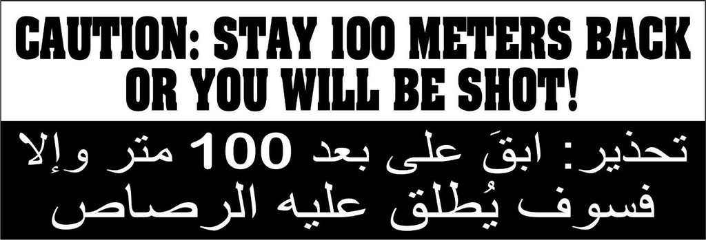 Caution Stay 100 Meters Back Or You Will Be Shot Bumper Sticker 8.8" x 3" Decal