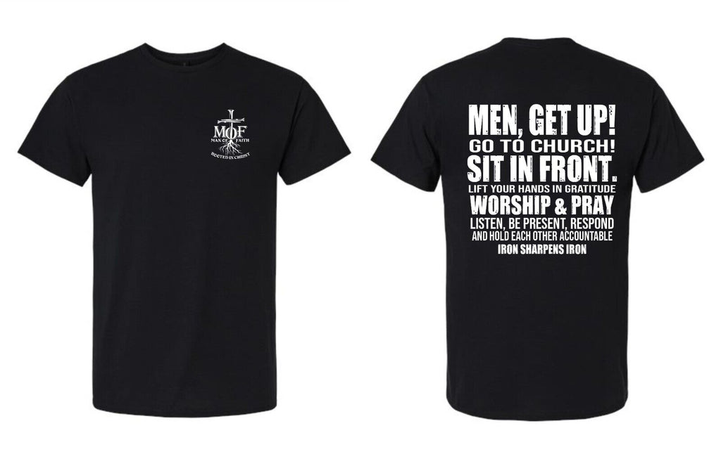 This is the MENS GET UP Go to Church custom NL 3380 Short Sleeve Black T-shirt. Each shirt has the Proverbs 27:17 Iron Sharpens Iron design on the front chest and my custom "Where there is no man BE THE MAN" design printed on the back. This shirt is available is sizes from Small through 3X.