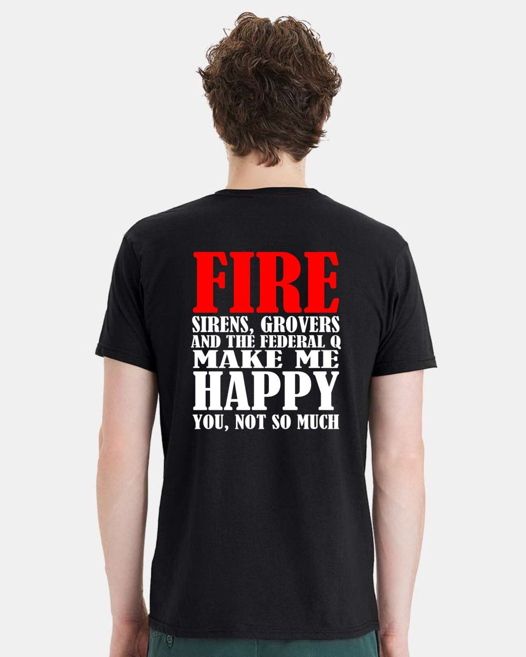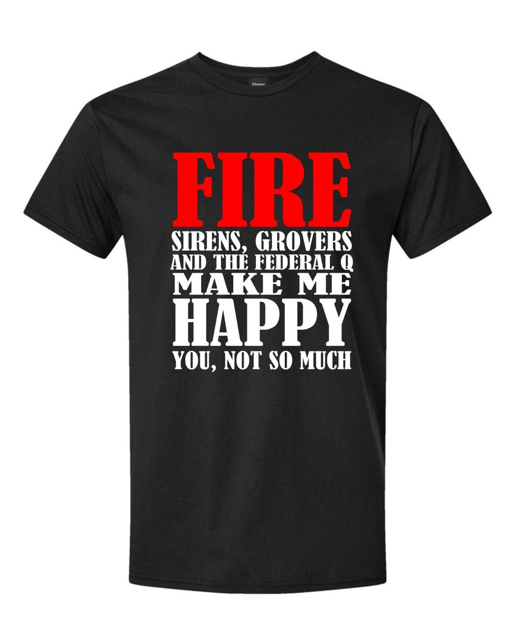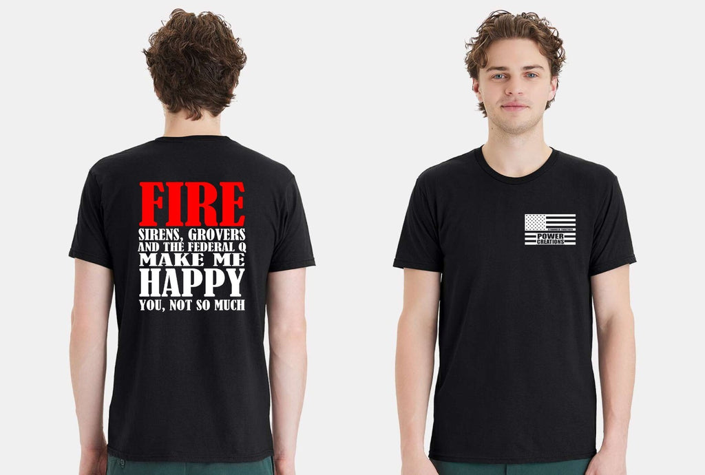 This listing is for the Fire, Sirens Grovers, Q make me happy Firefighter custom printed Tshirt. Each Tshirt has the design printed on the back and also has the Power Creations Stronger Together Flag on the front.