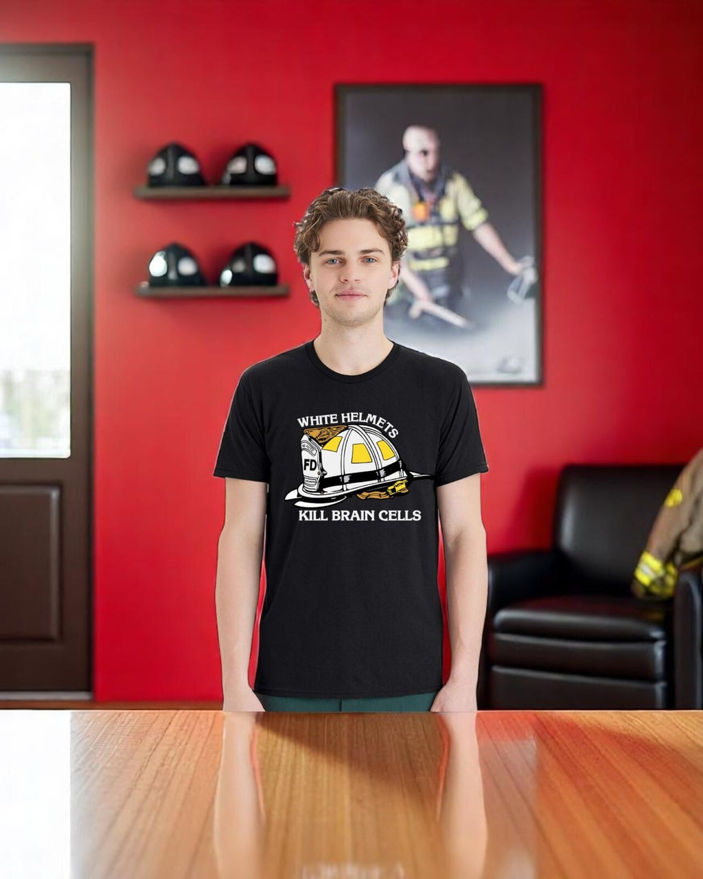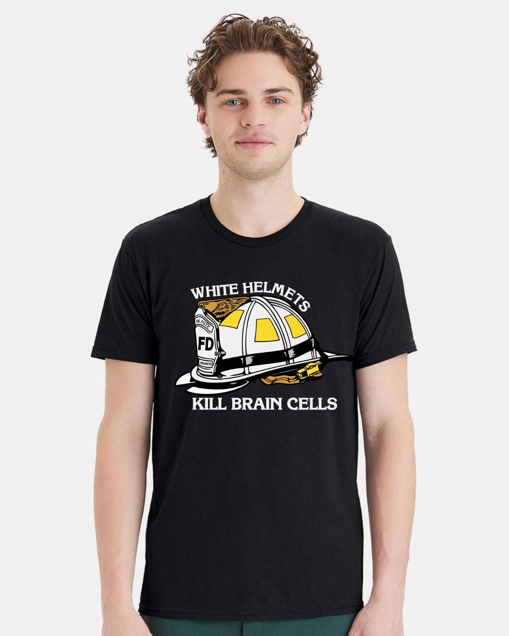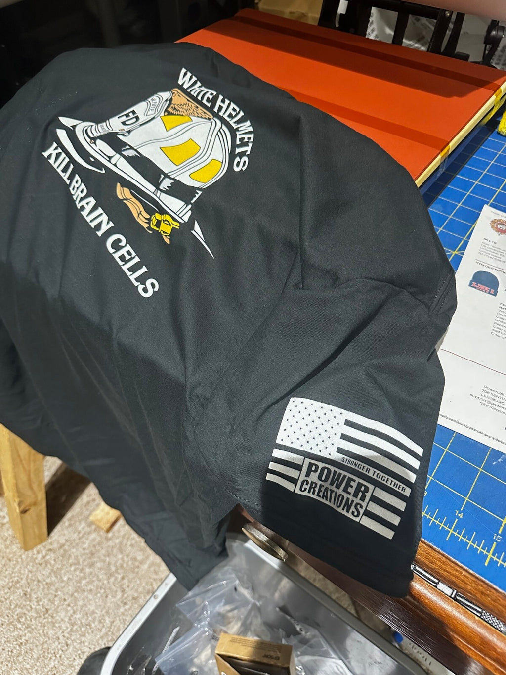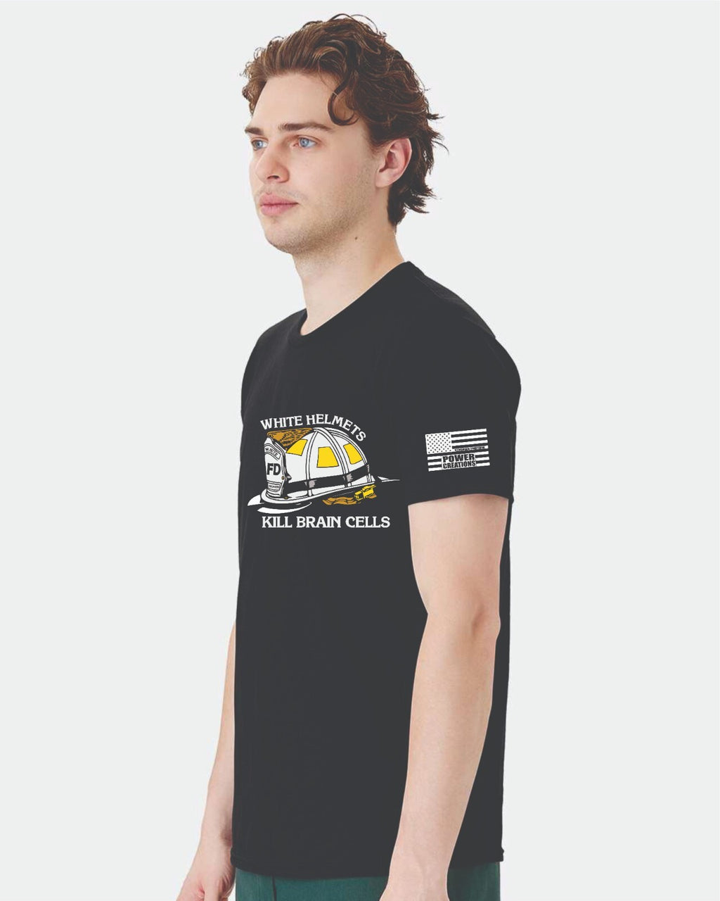 This listing is for the White Helmets Kill Brain Cells Firefighter custom printed Tshirt. Each Tshirt has the design printed on the front and also has the Power Creations Stronger Together Flag on the shoulder.