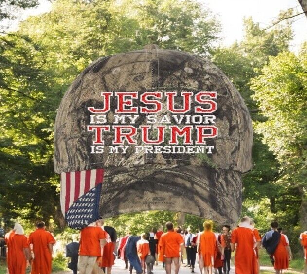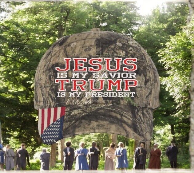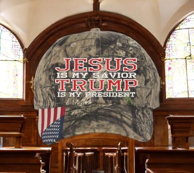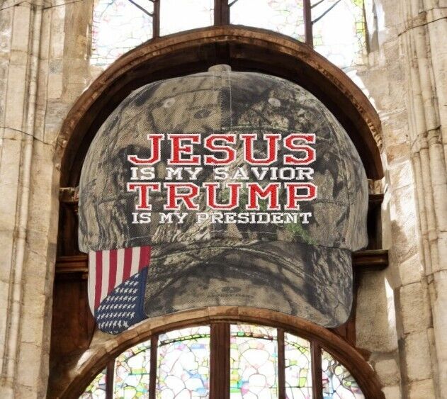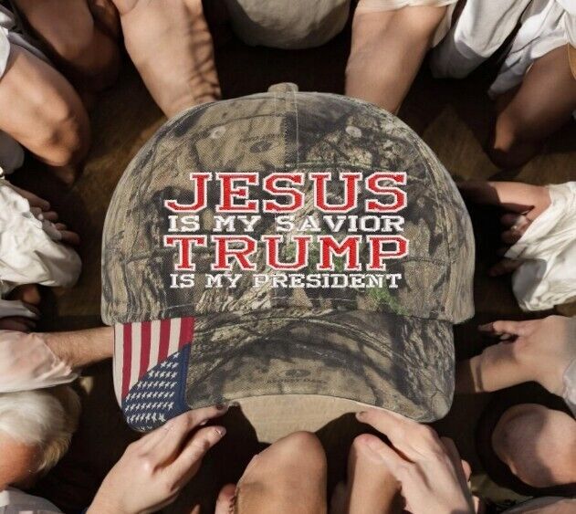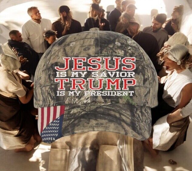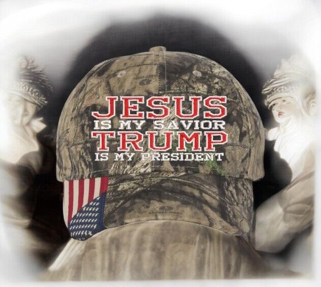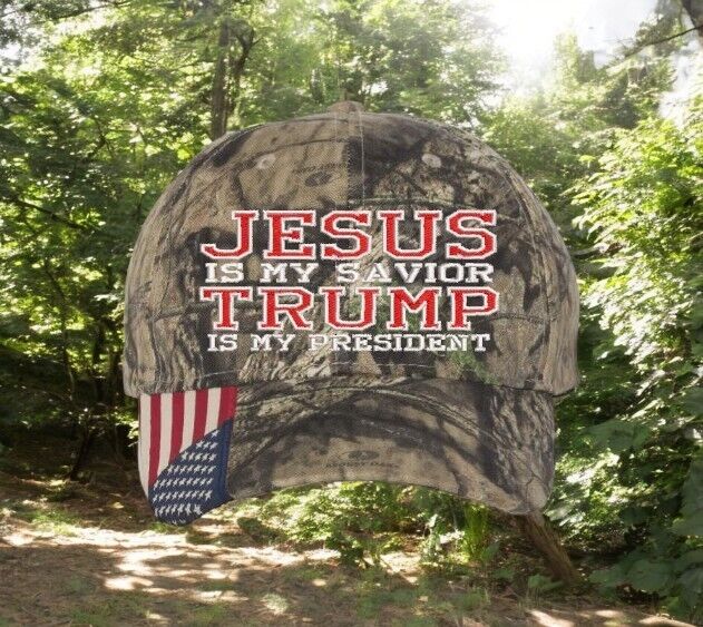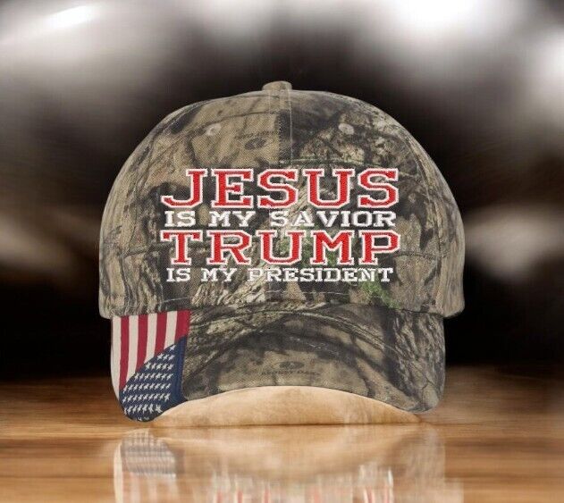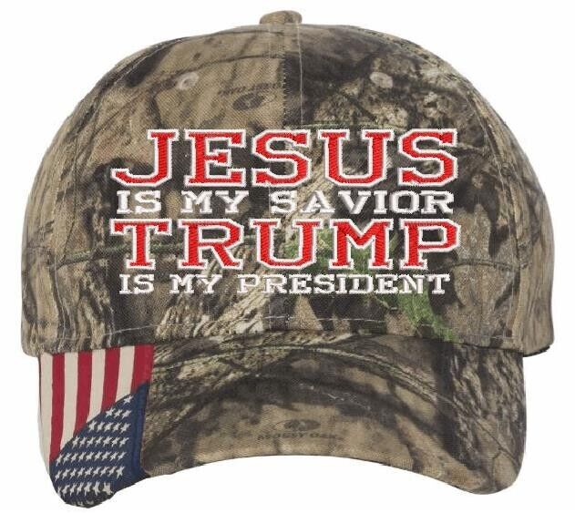 Jesus is my savior Trump is my President Trump Hat - Mossy Oak Camo w/ USA Flag
