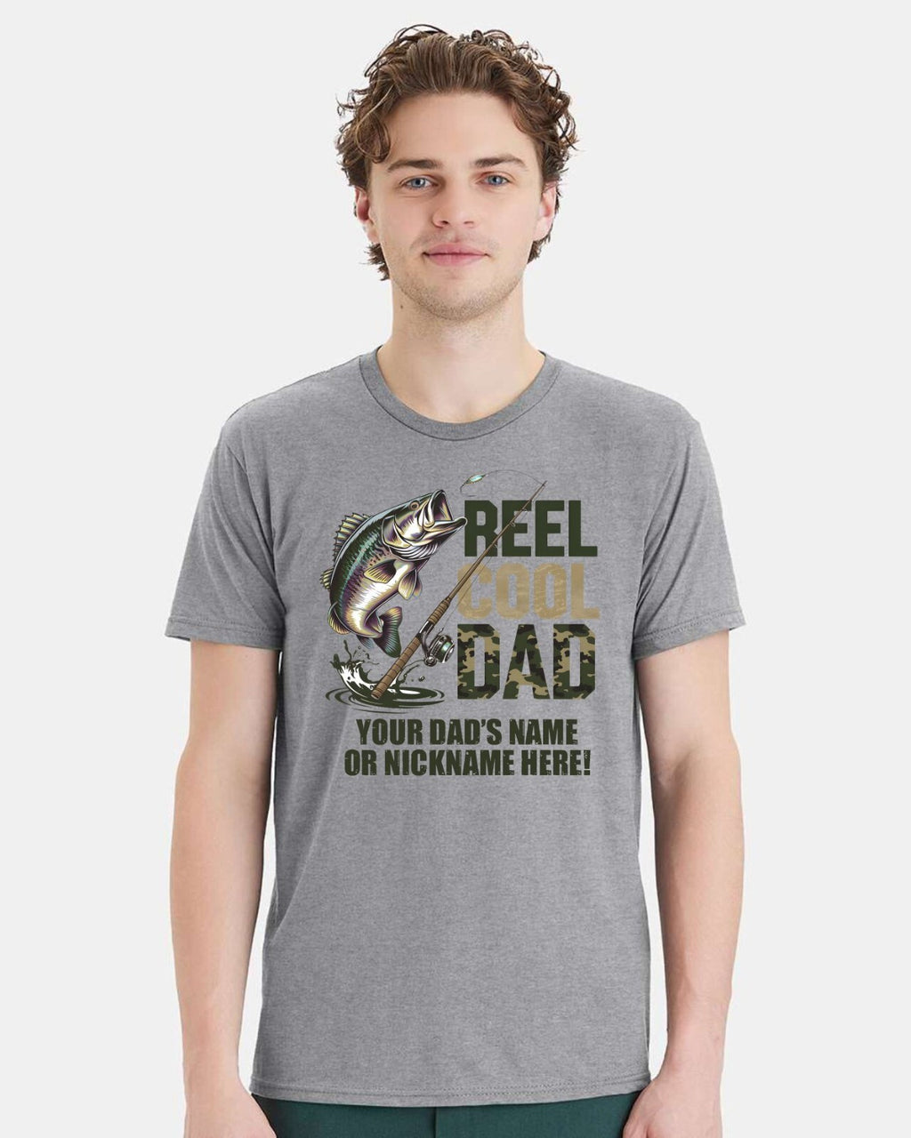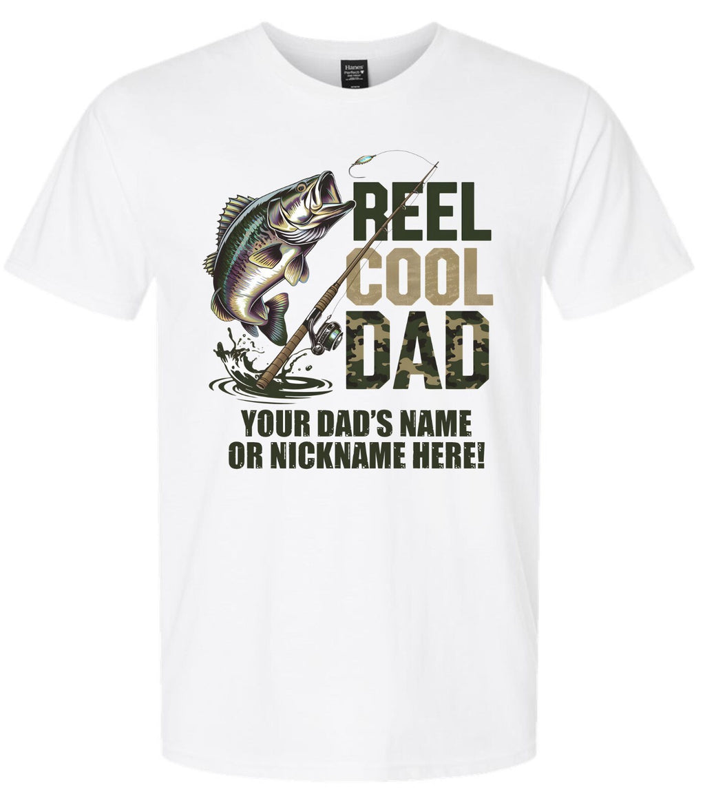 Reel Cool Dad Tshirt Fathers Day CAMO DESIGN with your dad's custom name printed