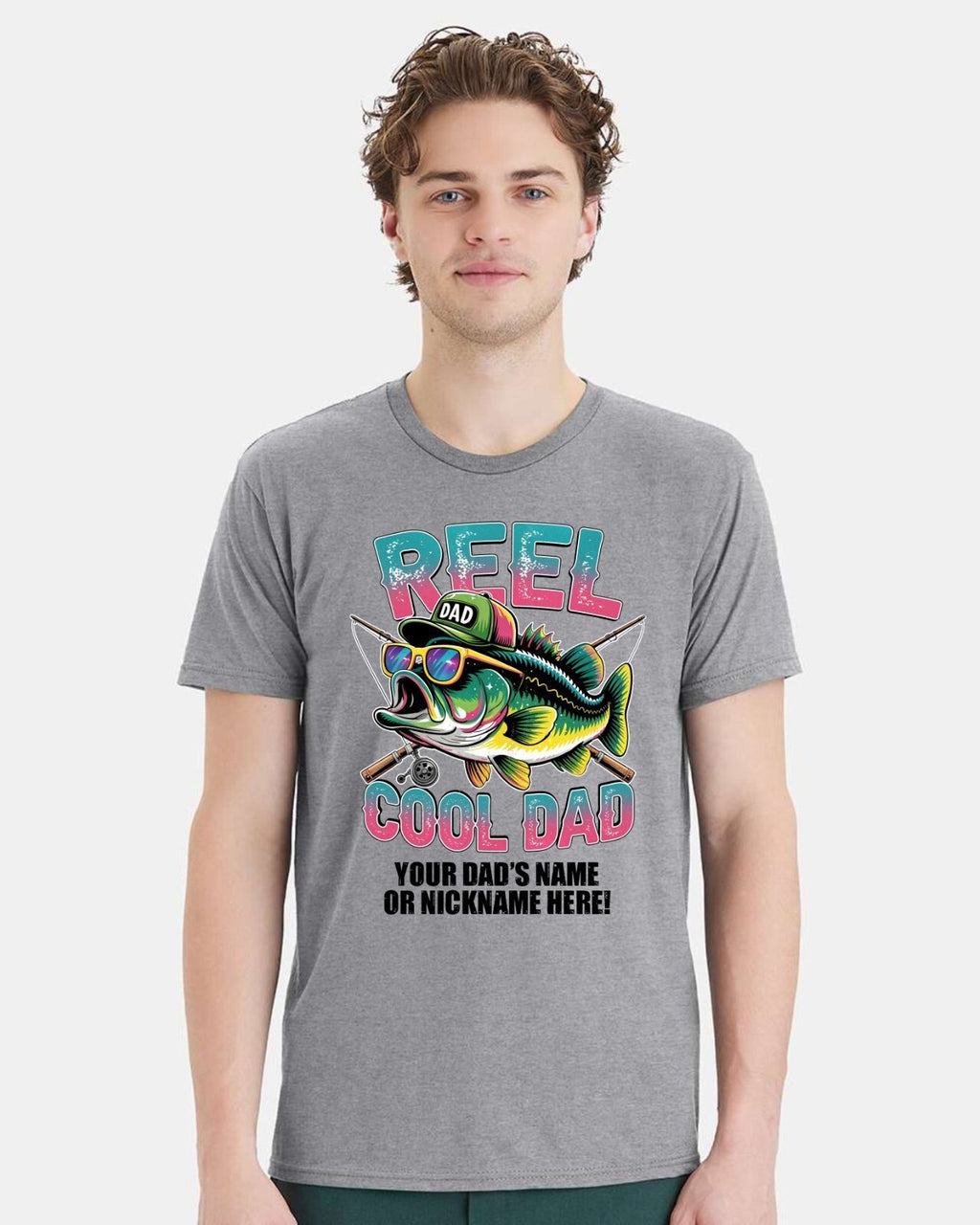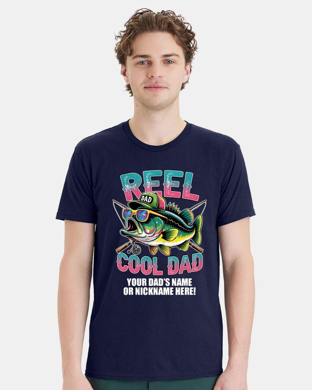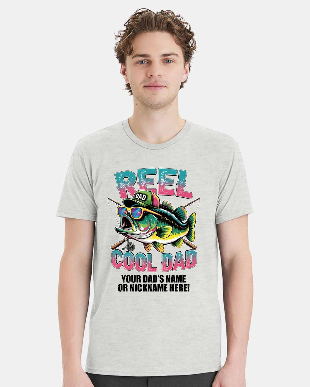 Reel Cool Dad Tshirt Fathers Day Shirt Fish with Hat and Custom Dad's Name Below