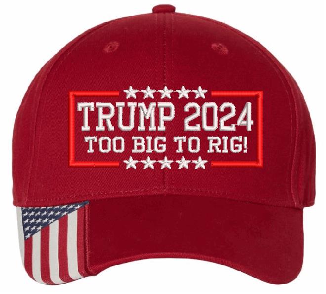 Too Big To Rig Trump 2024 Hat Embroidered AM350S Flag Brim RED Hat Trump 2024