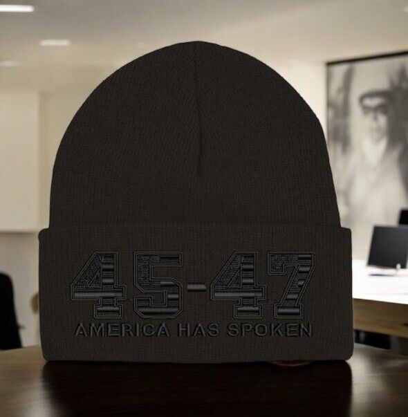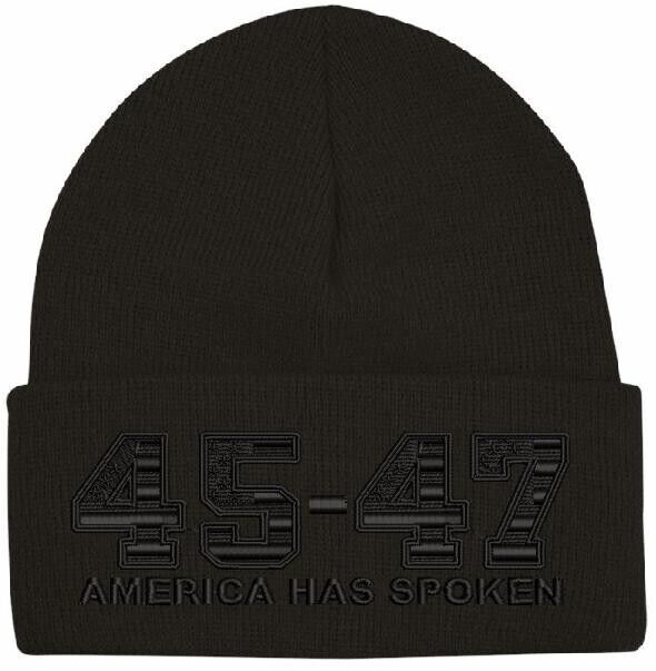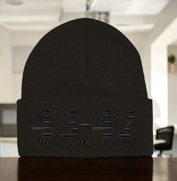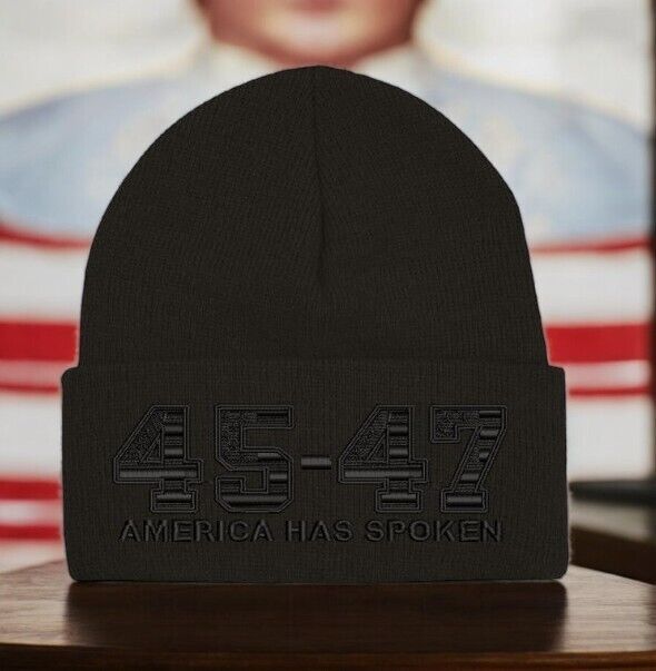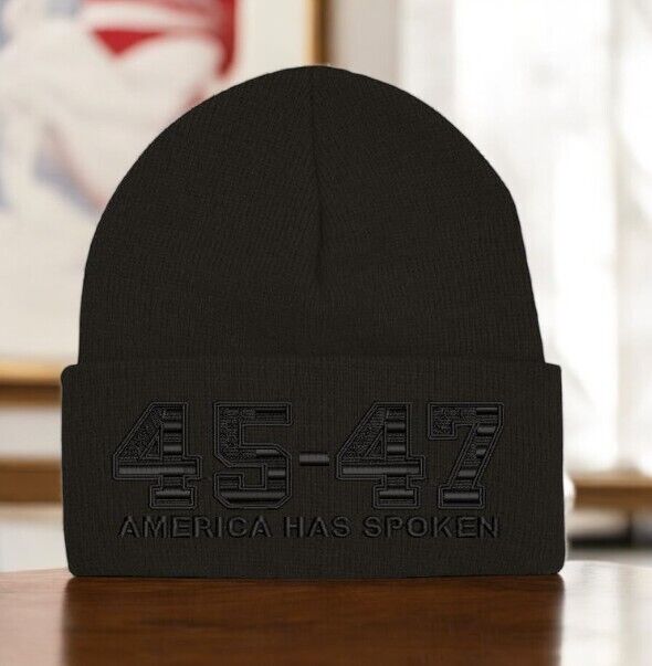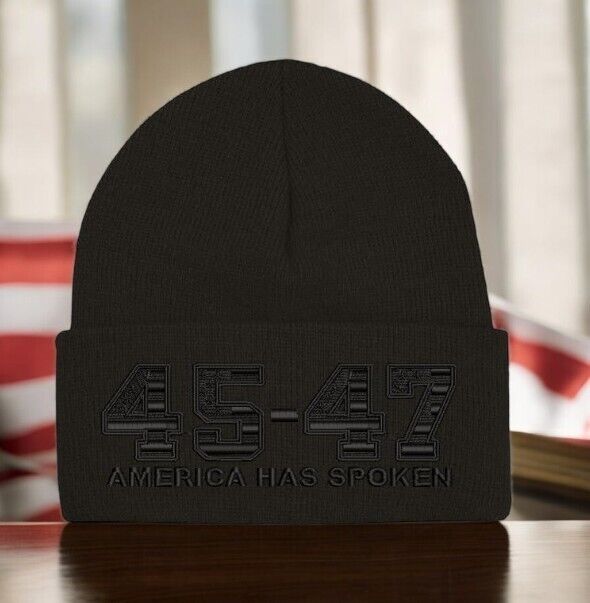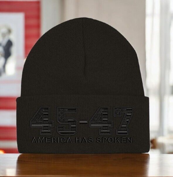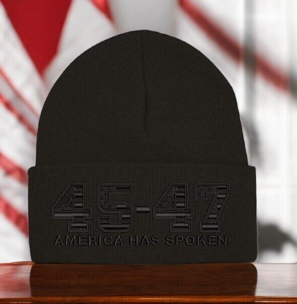 Trump 2024 Winter Hat - 45-47 BLACKOUT Black Winter Hat - Black Cuff Beanie