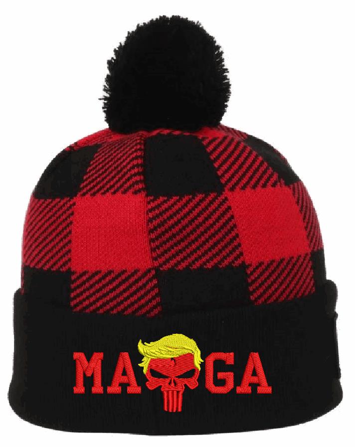 Trump 2024 Winter Hat Maga Skull Red Checker Winter hat with Pom Pom Embroidered Trump 2024 Cuff Hat