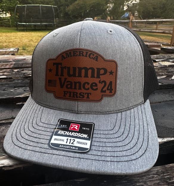 Trump Vance 2024 Leather Badge Hat America First Heather/Black Mesh Back Hat